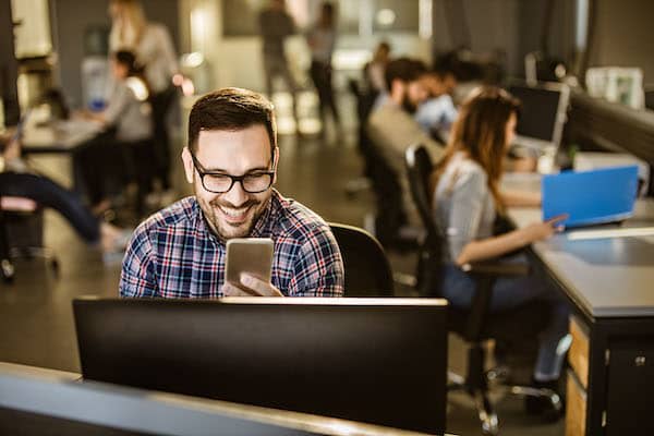 Man smiling at smartphone while working in office Credit: skynesher / E+ / Getty Images