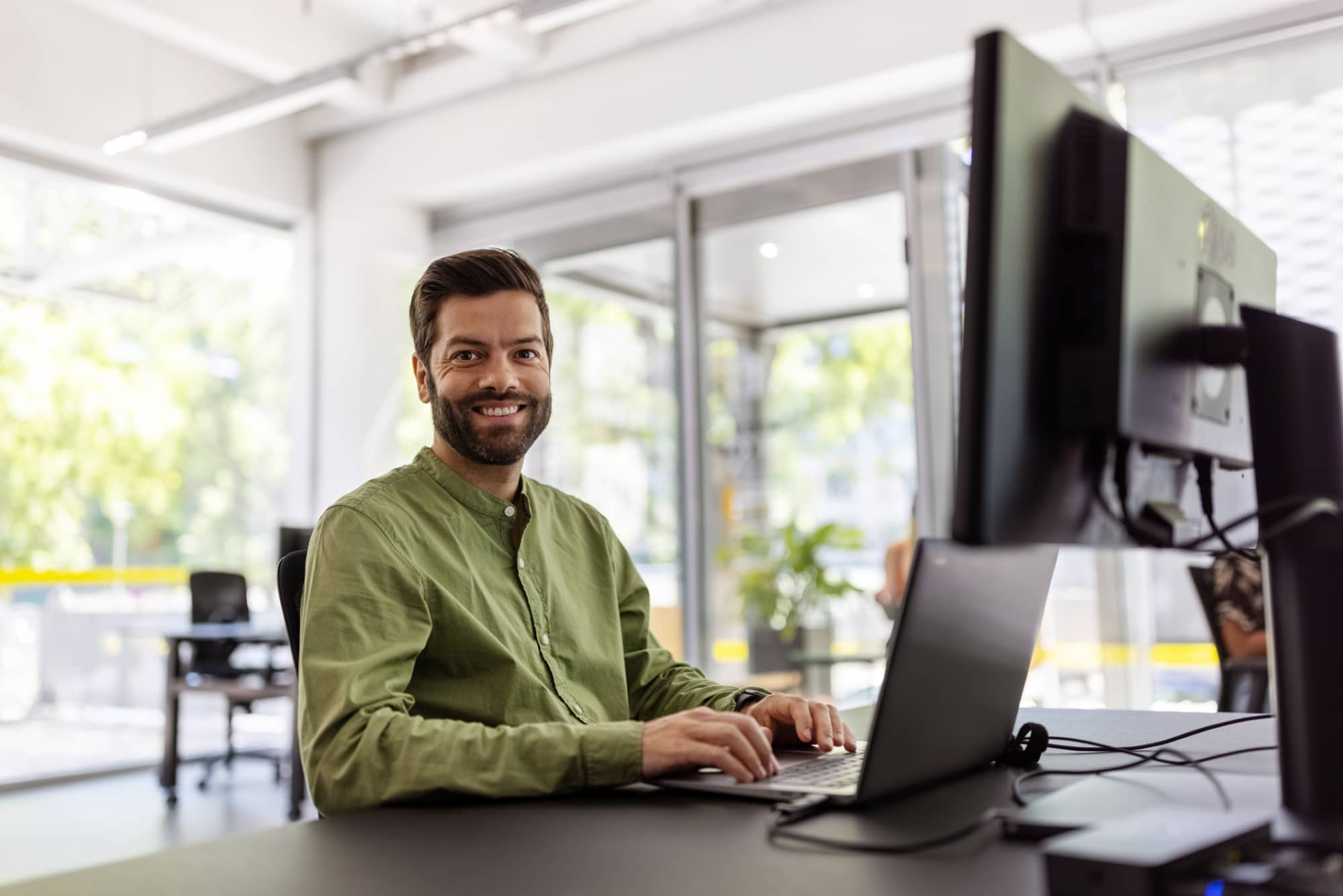 Man smiling and typing on computer in office Credit: Luis Alvarez / DigitalVision / Getty Images